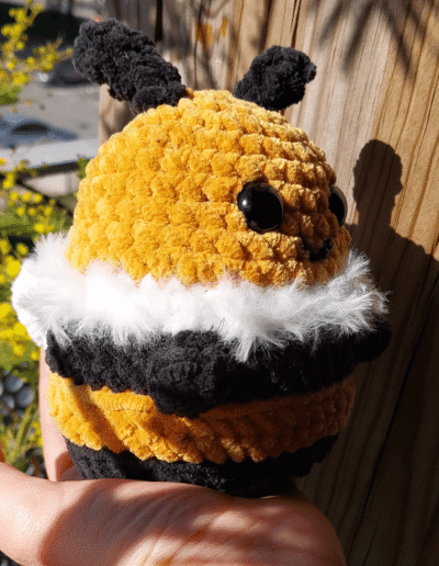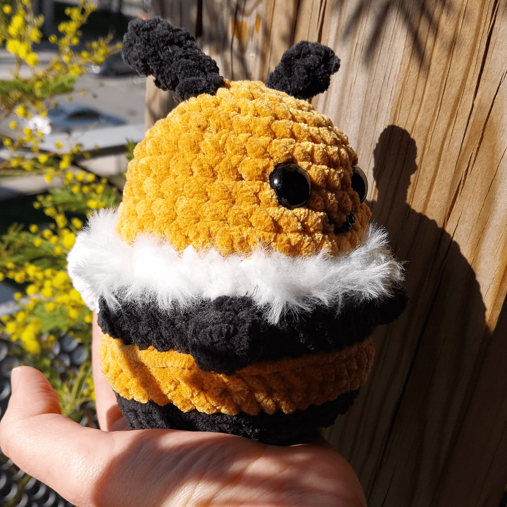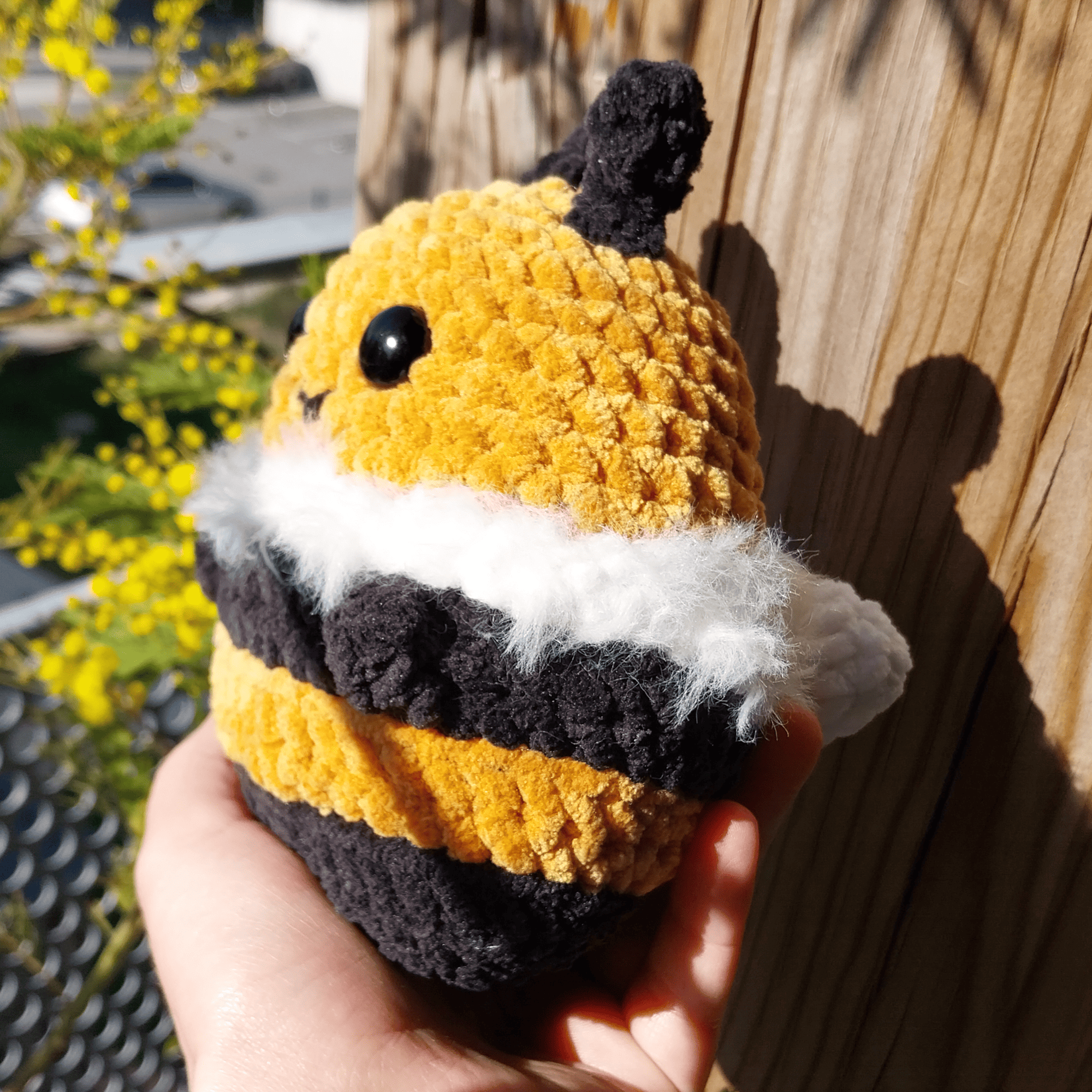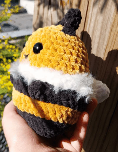 La petite abeille est réalisée au fil chenille et pelucheux, pour la rendre vraiment toute douce !
