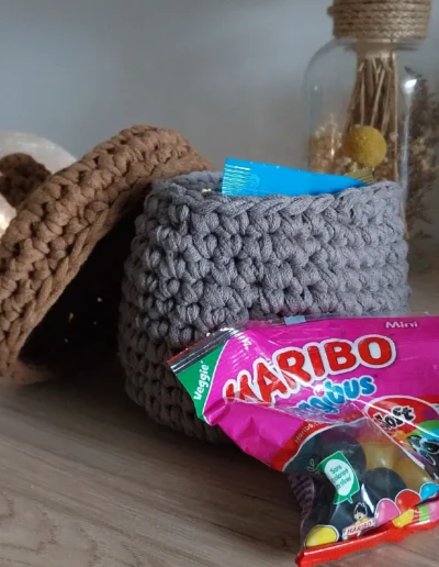 Sans son chapeau, ce panier gland fait environ 9 cm de hauteur pour un diamètre intérieur de 9cm. Assez pour y ranger 4 ou 5 mini paquets de bonbons !