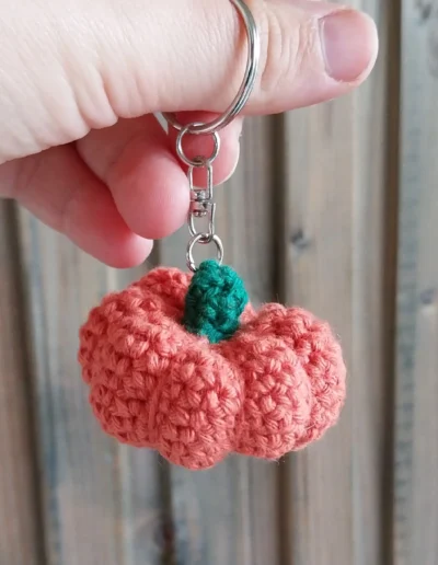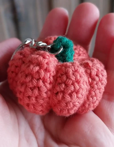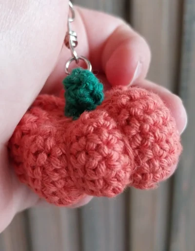 Ce porte-clé citrouille au crochet mesure 2cm de haut (sans la tige), pour un diamètre de 4cm environ.